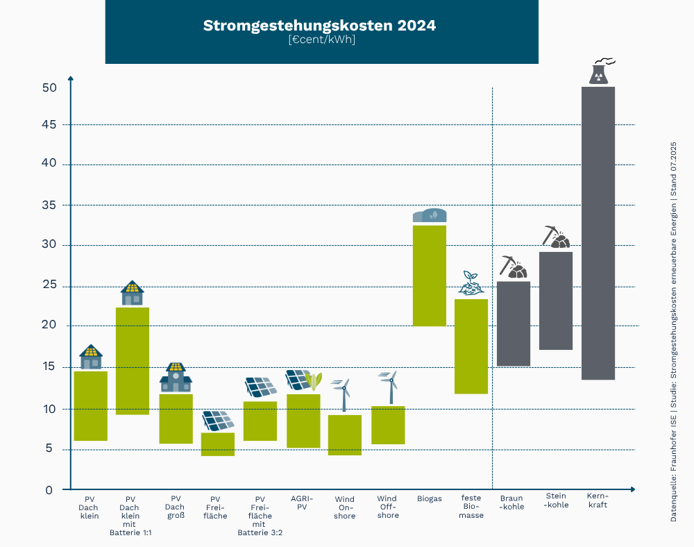Laut einer Studie des Fraunhofer-Instituts für Solare Energiesysteme (ISE) aus dem August 2024 sehen die Stromgestehungskosten in Deutschland wie folgt aus: