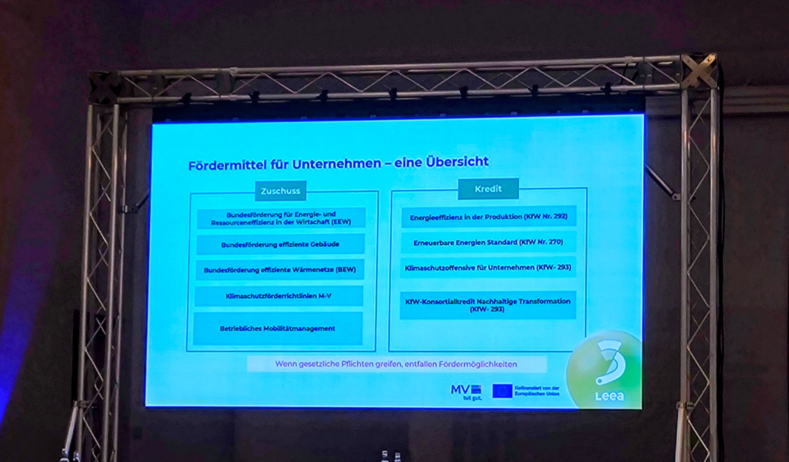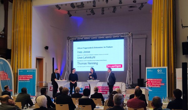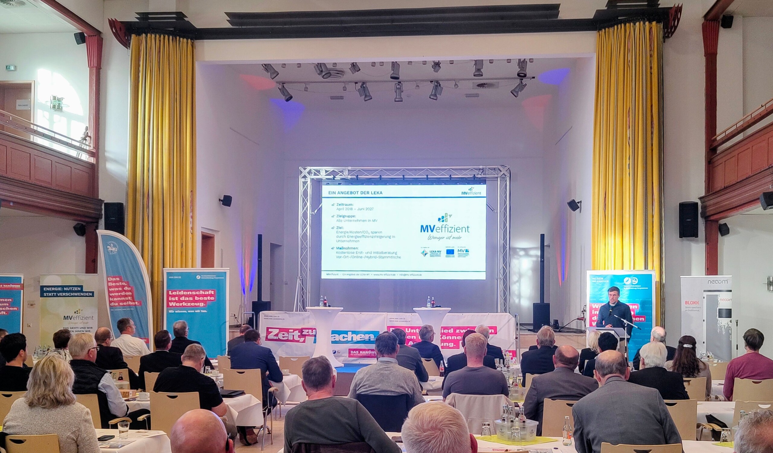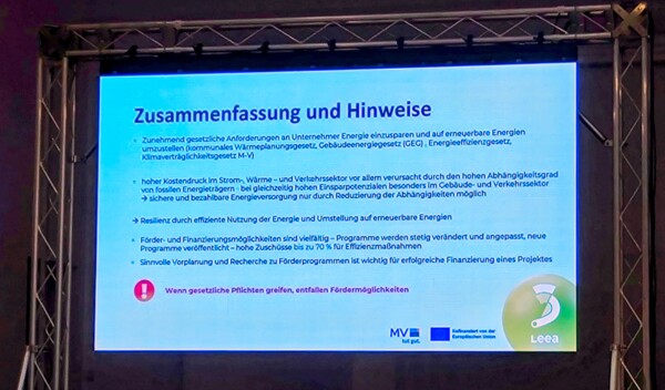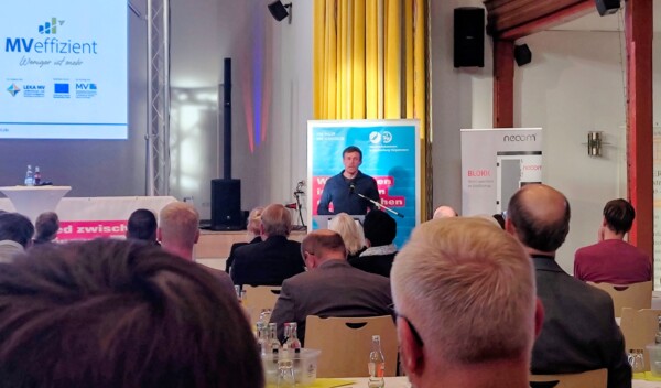 Im Rahmen der Fachbeiträge stellte unser Kollege Robert Reinschmidt das Effizienz-Beratungsangebot für Unternehmen vor. Die kostenlose und neutrale Beratung zeigt auf, wie Effizienzpotenziale im Betrieb identifiziert, erneuerbare Energien eingebunden und Energieverbräuche nachhaltig reduziert werden können. Außerdem informierte Stefanie Beitz vom Landeszentrum für Erneuerbare Energien über aktuelle Fördermöglichkeiten, die speziell kleinen und mittleren Unternehmen Investitionen in Sachen Energieeffizenz erleichtern.