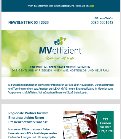 Mit unserem monatlichen Newsletter informieren wir Sie über Neuigkeiten, Veranstaltungen und Termine rund um das Angebot der LEKA MV für mehr Energieeffizienz in Mecklenburg-Vorpommern: MVeffizient.